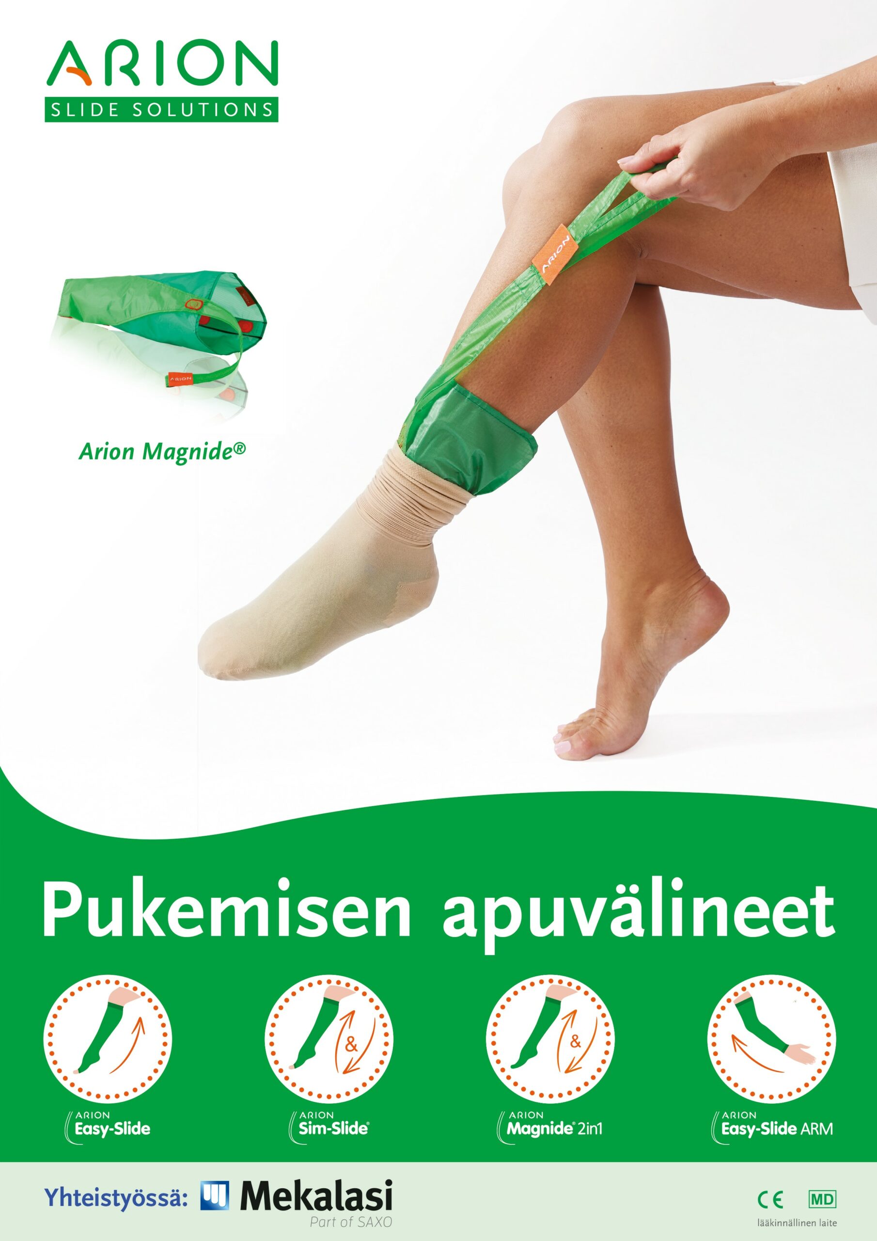 Arionin ikkuna- tai lasitarra, jossa mainoksena pukemisen apuvälineet. Koko A4. Kuvapuoli liimautuu lasiin.