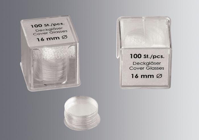 Täysin väritön ja kirkas pyöreä peitinlasi. Pakattu kaksiosaiseen muovirasiaan.