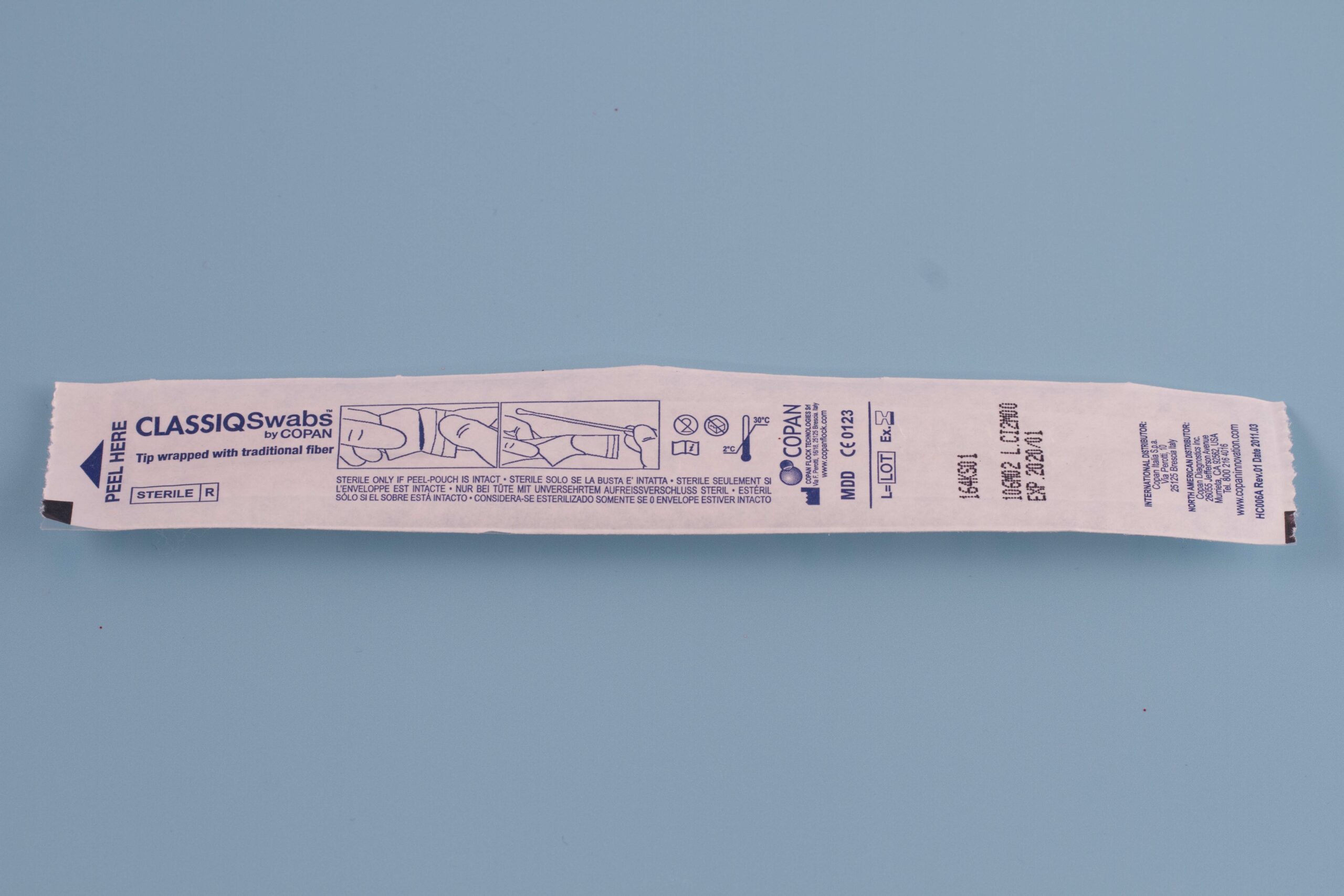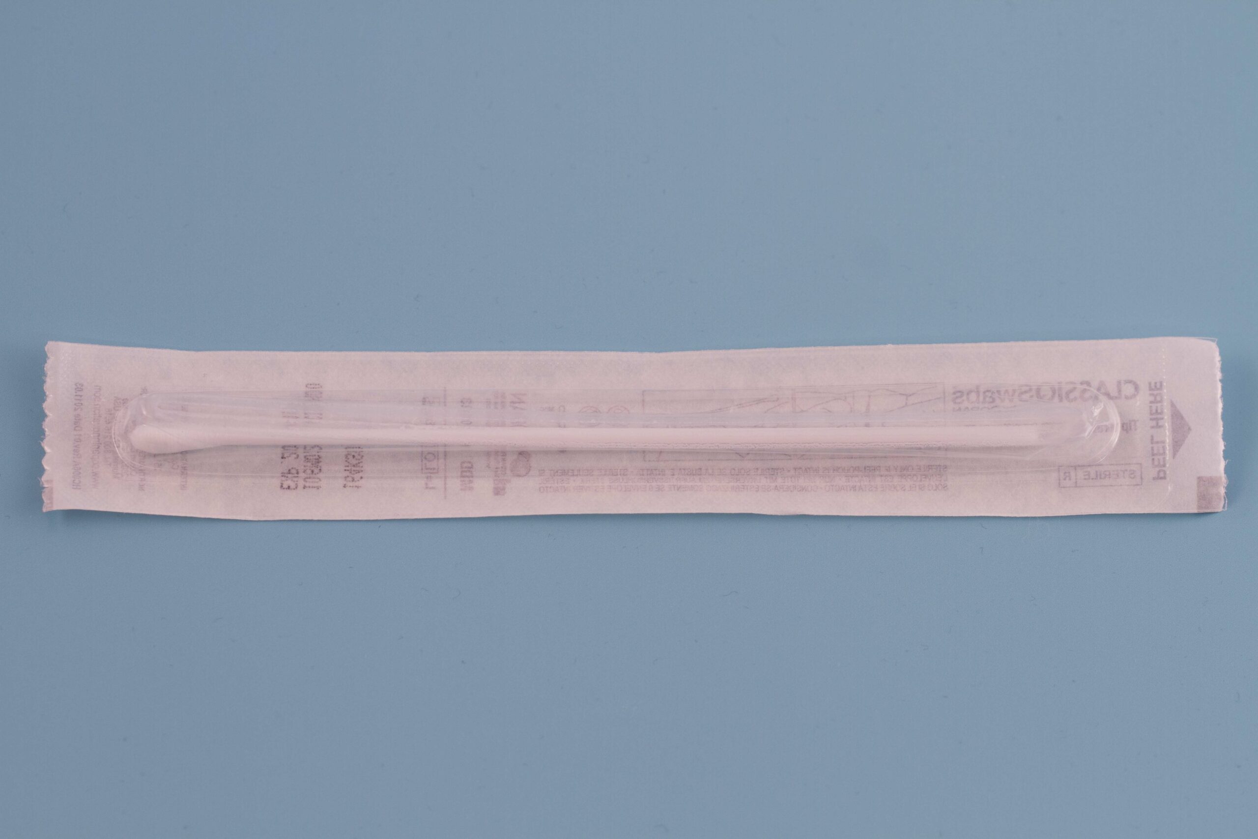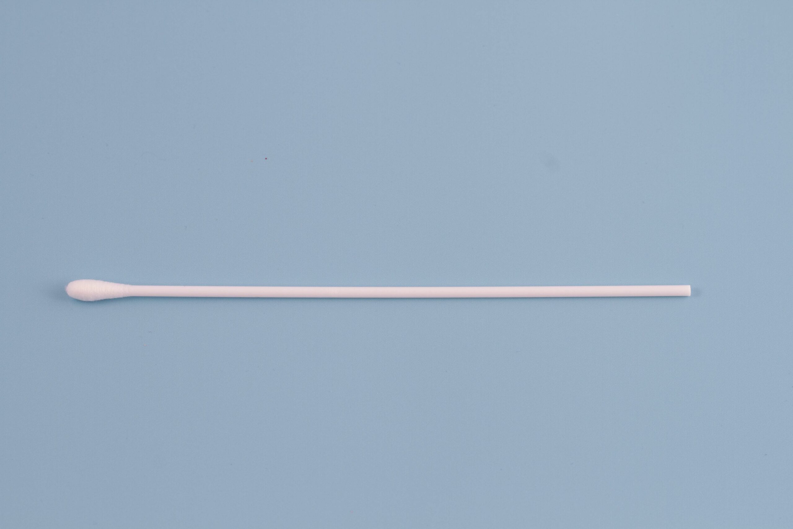 Steriili polyesteri-vanutikku muovivarrella. Yksittäispakattu pussiin.