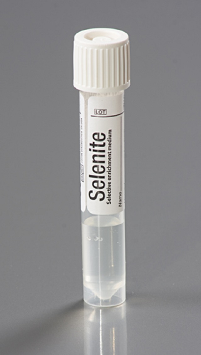 Seleniitti-rikastusputki salmonellalle ja shigellalle. Valkoinen korkki.